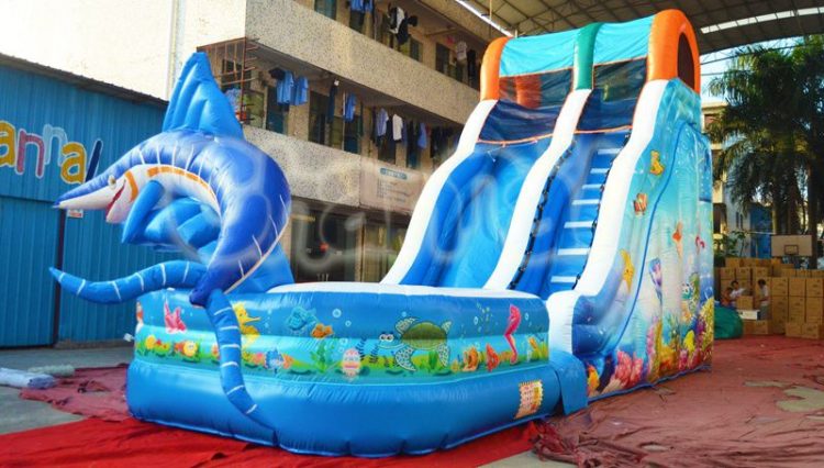 Check out our ocean tuna theme 18 feet height inflatable water slide for your kids. This unit features a slippy water slide with a hump for multiple children, and a cool water splash pool. Kids can spend most time of a day in this water slide inflatable. If you’re thinking of adding more sea themed inflatable water slide to your rental inventory, luckily we have many units you may have interests.
