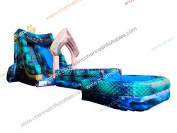 Our 19 ft Aquaman theme waterslide will definitely be the first choice for superhero fans. This large water slide features Aquaman symbol as the arch, The Trident on the top and blue-green Aquaman body scale style railing barriers. Every passersby would not going to miss this slide in your event. It’s great for superhero theme birthday parties.