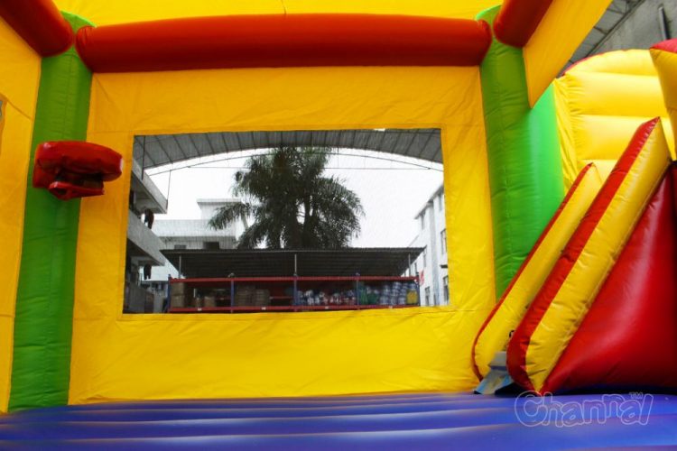 Are you good at all sports games, if so, then this sports arena inflatable castle combo is right for you. The combo with a slide presents the theme of basketball, volleyball, soccer and football together. The slide ends inside the bounce house, so kids would stay inside all the time. Check out our another sports theme combo bouncer.