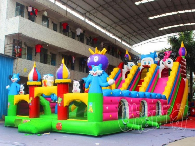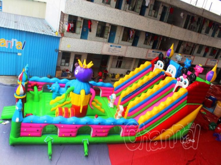 Check out this giant cartoon animals characters inflatable playground manufactured by Channal inflatables, a large outdoor playground for kids to play.