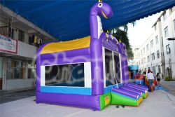 Check out our Channal purple dino dinosaur inflatable combo, the combo apposes a large bounce house and an inflatable dry slide together. All of them got a gentle slide ramp as cushion mat at the entrance/exit. An inflatable climbing wall inside the bouncer for kids to shin.