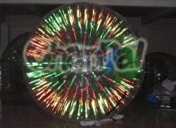 High quality fluorescence glowing zorb ball made by Channal, extremely fit for zorbing at nights. This big human zorb ball with fluorescence strips is perfect to be played at an outdoor gentle slope when the sky is dark. Make it roll down the slope, enjoy the colorful lighting effects and rolling fun. You may also need a water zorb ball with lights.