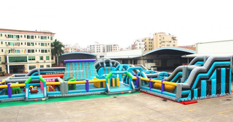 Almost all inflatables you want to have for your indoor fun family center are in this huge indoor inflatable playground. You should see a big climbing wall, a large obstacle course around the edge, giant slides, a toddler play zone, a wipeout course, a wrecking ball game, a football gate and so on. I bet kids and their parents will have a great time on this giant indoor playground.