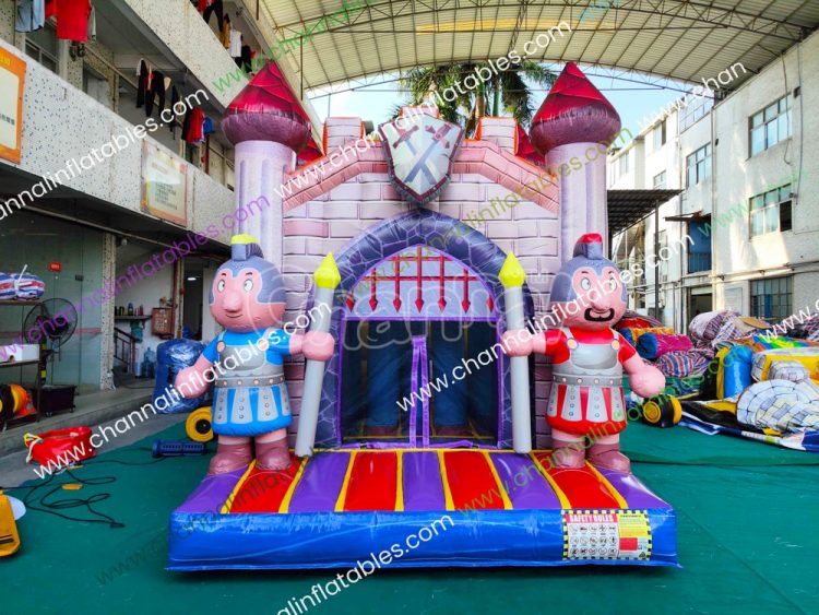 This medieval knight’s castle inflatable course contains inflatable obstacles, a climbing wall and a slide. It features 2 inflatable guards defending the gate of castle.