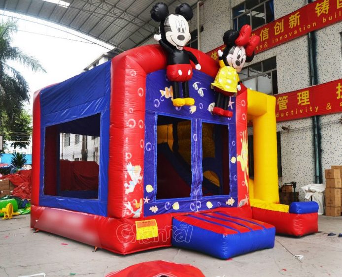 Check out our Channal Mickey Minnie mouse theme inflatable combo, this unit features a large jumping area and a inside inflatable dry slide.
