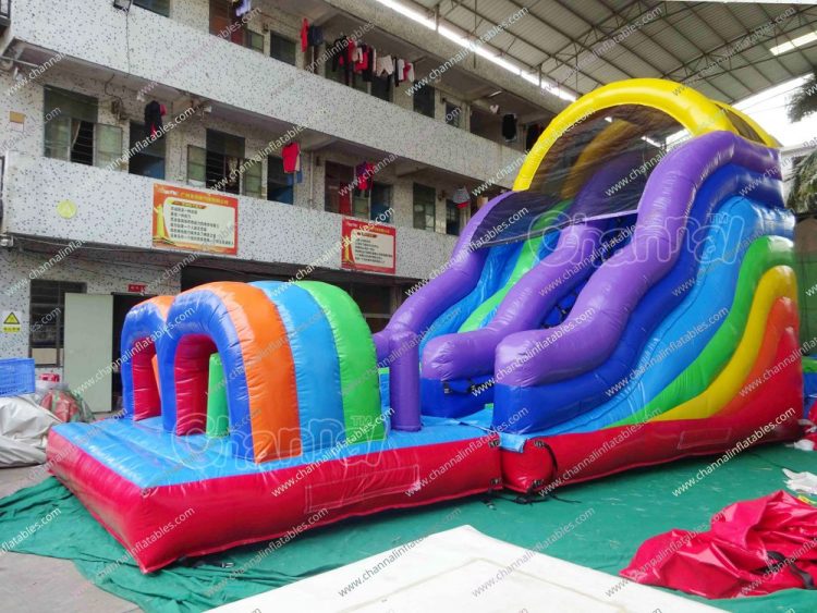 This 18 ft rainbow color inflatable slide is capable for both water and dry usage. Meanwhile, the front is detachable and can be changed to obstacle entrance or pool.