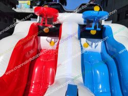 Prove that you are the fastest man on this bungee run basketball game. You and the other opponent need to drag yourselves forward against the bungee cord and aim balls at the basketball hoop in front. This speedster theme basketball bungee run will be suitable for birthday party, company picnic, carnival and school event.